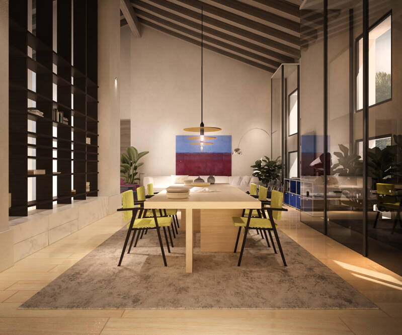 Gli spazi sono suggestivi con alte e ampie finestre che guardano il parco interno. Soffitto con travi a vista.